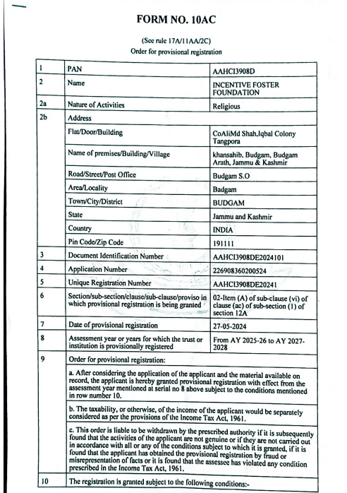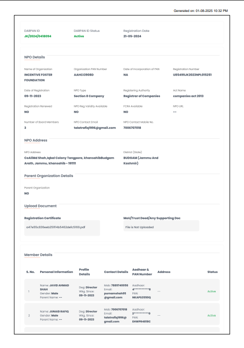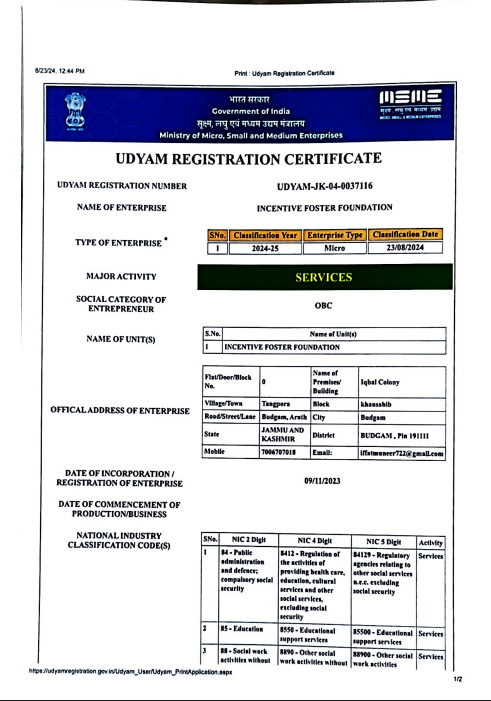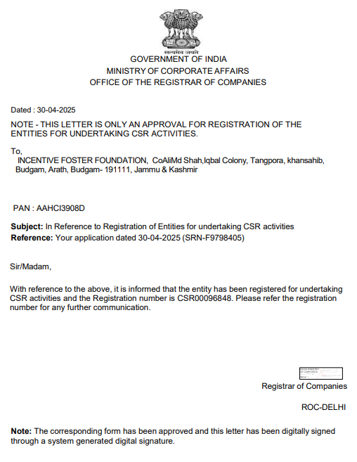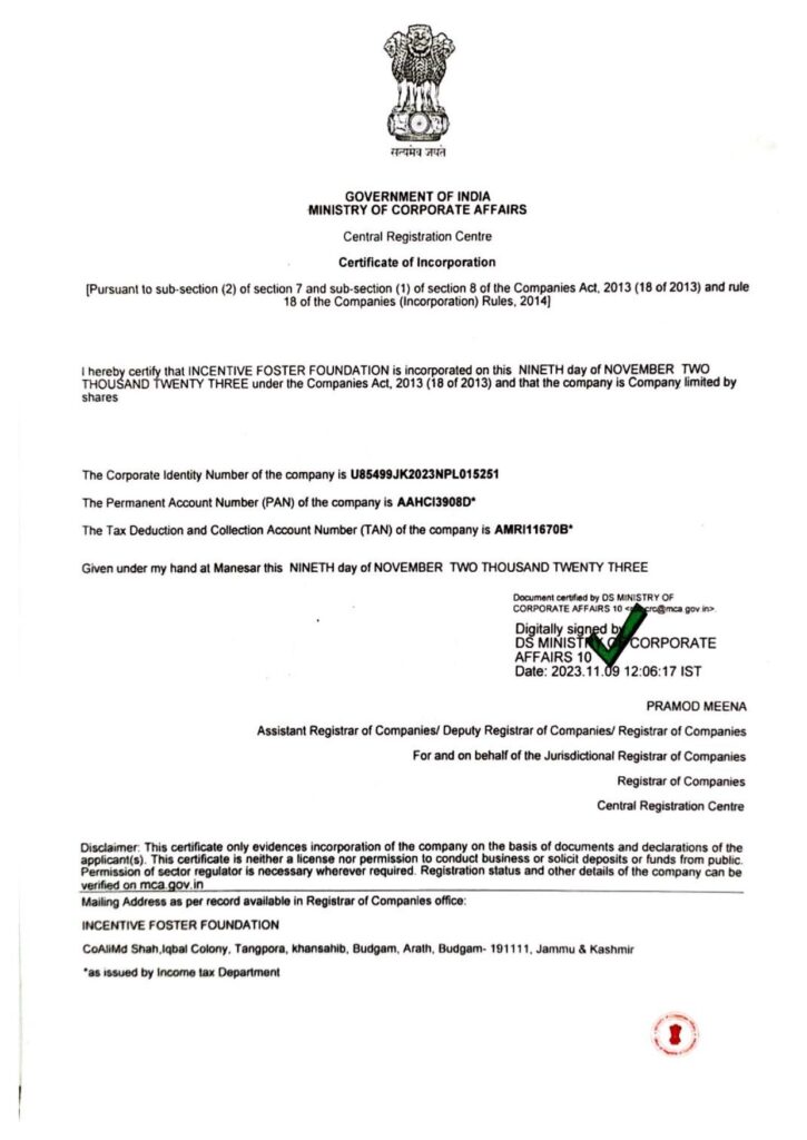 Our organization is officially registered and recognized under the relevant government authorities. These certificates reflect our commitment to transparency, legal compliance, and responsible service towards society and community welfare initiatives.